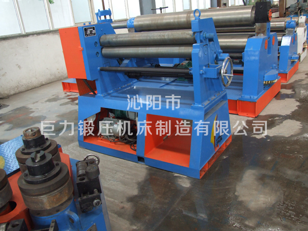 The structure of the three-roller asymmetrical plate winder is three-roller asymmetrical, the upper roller is the main driving roller, and vertical lifting motion is made at the central symmetrical position of the two lower rollers. It provides torsion force for the rolled sheet and acts as the main drive. The side roll is inclined to lift and has the dual functions of pre-bending and rolling, compact structure and convenient operation and maintenance.