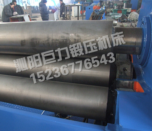 Compared with the symmetrical three-roll plate winding machine, the four-roll plate winding machine can bend the end of the plate directly without the aid of other equipments and dies, and the remaining straight edge is smaller; it can make the plate turn into a workpiece without turning the head.