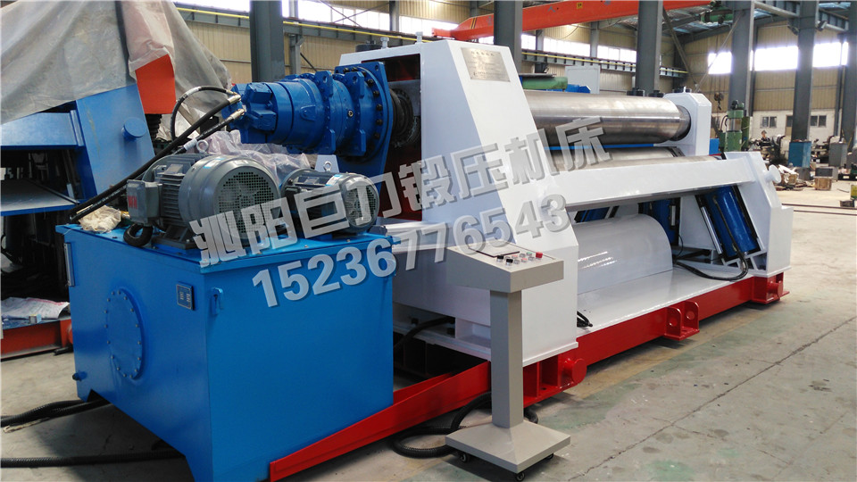 Compared with the symmetrical three-roll plate winding machine, the four-roll plate winding machine can bend the end of the plate directly without the aid of other equipments and dies, and the remaining straight edge is smaller; it can make the plate turn into a workpiece without turning the head.