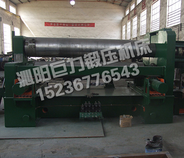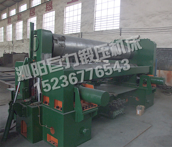 2、三個工作輥均為主動輥,上輥升降和兩下輥平移均由NC控制,確保對任何厚度的板材有良好的送進(jìn)卷制功能,且板材始終處于夾緊狀態(tài),避免板材滑動、跑偏;